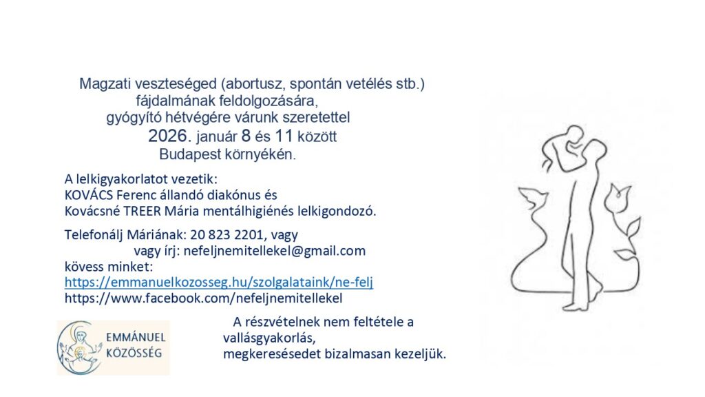 Magzatvesztés fájdalmát hordozókat hívunk lelkigyakorlatra, melynek gyümölcseként szívbéli gyógyulások, életrendezések, születések történtek. Várjuk mindazokat, akik gyermeküket vetélés, abortusz, koraszülés miatt, illetve lombik babájukat veszítették el. A gyász érzése nem válogat hívő és nem hívő társaink között.